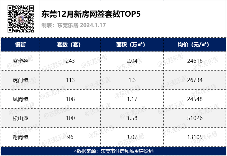 新房销售套数排名前5位的镇街依次是:寮步镇(243套)、虎门镇(113套)、凤岗镇(108套)、松山湖(100套)、谢岗镇(96套)。