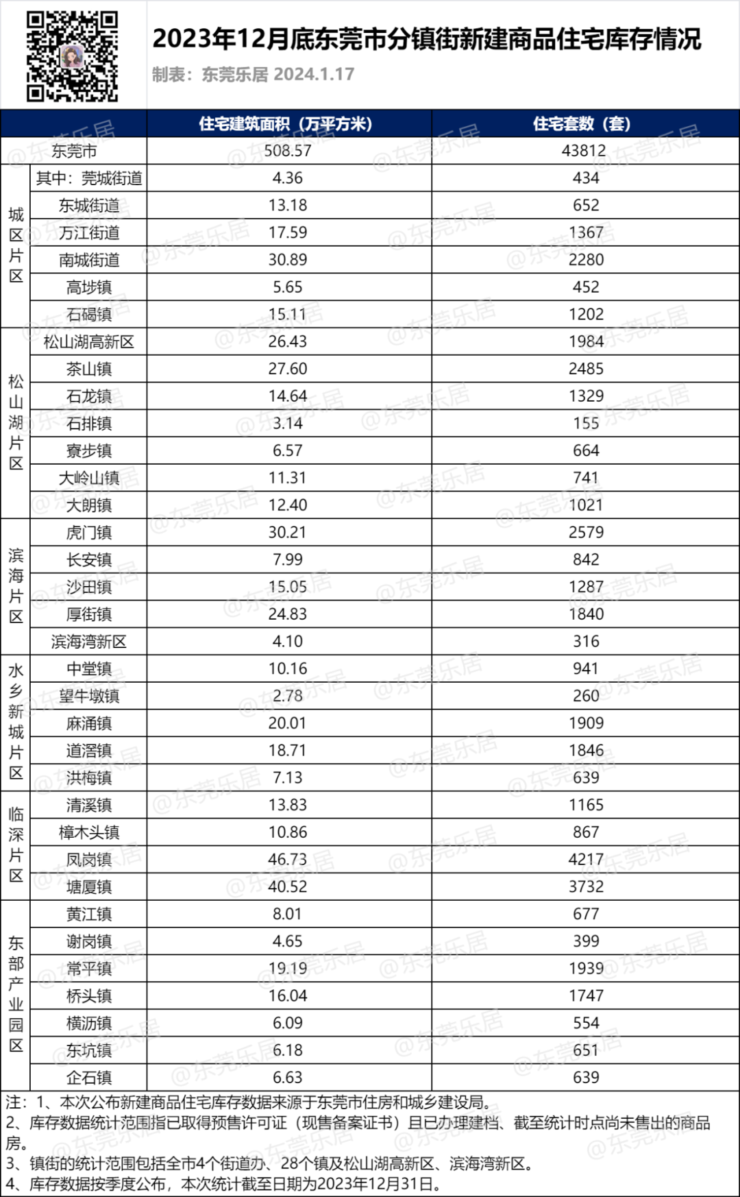 据官方统计数据显示,截止至2023年12月31日,东莞新建商品住宅库存共计43812套,住宅库存总建面为508.57万㎡,库存套数和库存建面同比2022年均增加约16.5%。