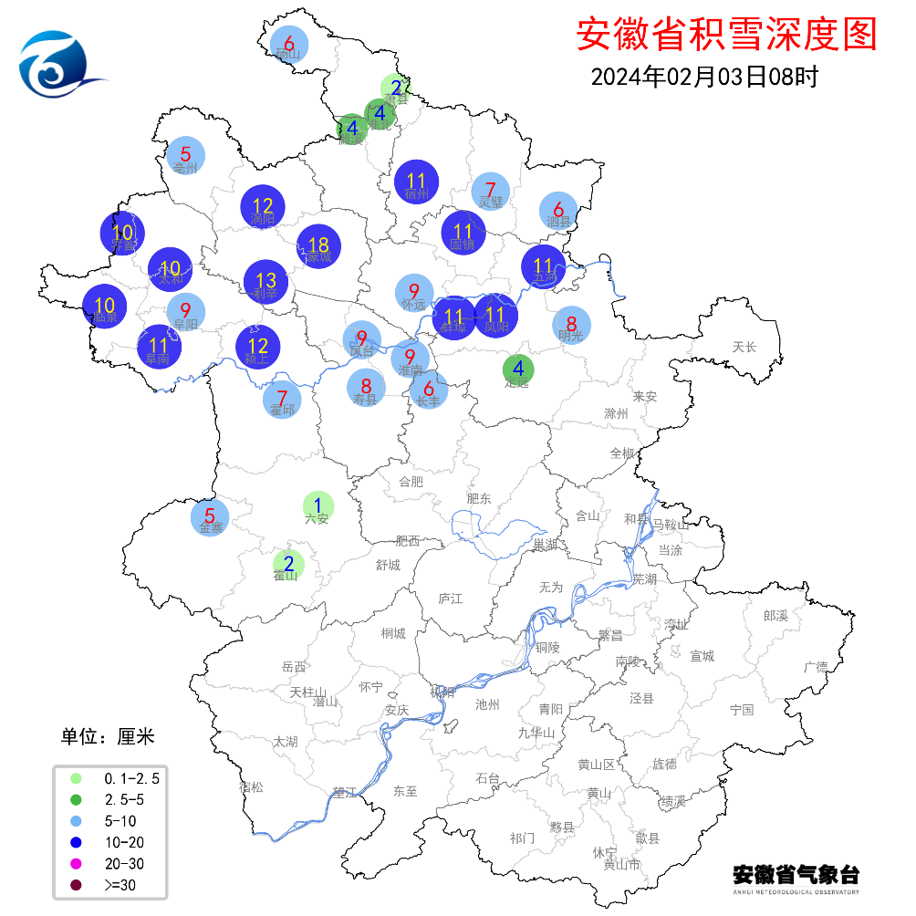 3日05时-3日08时,沿淮淮北大部分地区、大别山区和江淮之间东部有小雪,其中大别山区部分地区中到大雪,最大金寨5.4毫米。积雪情况:3日08时,沿淮淮北、江淮之间北部和大别山区共32个站有积雪,阜阳、亳州、蚌埠、宿州、滁州北部部分地区有超过10厘米积雪,最大蒙城18厘米。
