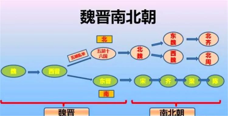 420年,权臣刘裕废东晋建宋,史称“刘宋”,与其后的齐、梁、陈并称为“南朝”。与此同时,北方经过一系列战争和整合,以381年鲜卑族建立北魏为标志,北方的一系列胡人政权被统称为“北朝”,中国进入了南北朝时期。
