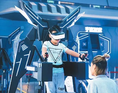 9月8日,小朋友在沪宁高速公路阳澄湖服务区“科技馆”内体验“滑雪”。许丛军摄(人民视觉)