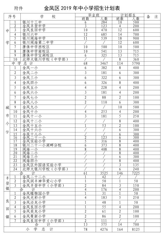 金凤区2019年中小学招生计划表