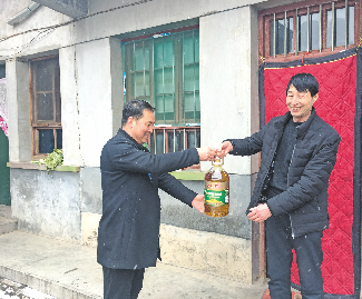 1月27日上午,不顾正在飘扬的雪花,在市区经营建筑砂石生意的曹辉开车赶回自己的老家——高新区磻溪镇小庵村,为该村四组的村民送去价值2万元的食用油。据了解,这已经是曹辉连续第5年为家乡群众免费送节礼了。当天上午,曹辉回到家乡后,就提着一桶油,冒雪来到58岁的村民杨乖莲家,为她送去节日的祝福。随后,78岁的张智礼、55岁的张宗科等村民都收到了曹辉送去的慰问礼品。曹辉说,他一共准备了价值2万元的食用油,将在几天内全部免费送给小庵村四组及组外部分村民。