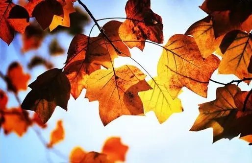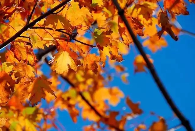 秋天的天空特别清爽明朗,晴朗的蓝天与叶子的颜色形成强烈反差,可以使叶子看上去更加艳丽。