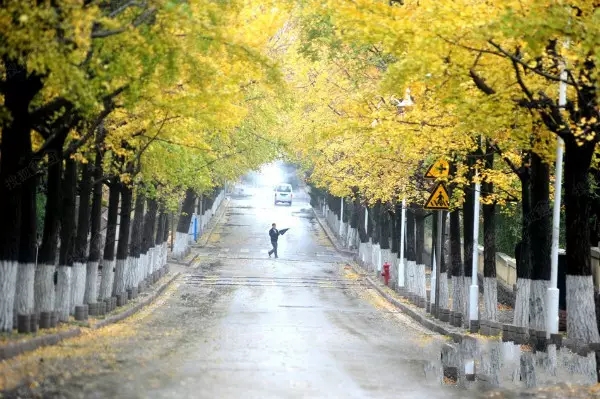 道路两侧种满了银杏树,巨大银杏遮住了路上的天空,入秋之后,秋风拂过,银杏树就披上了黄金衣,特别美丽。