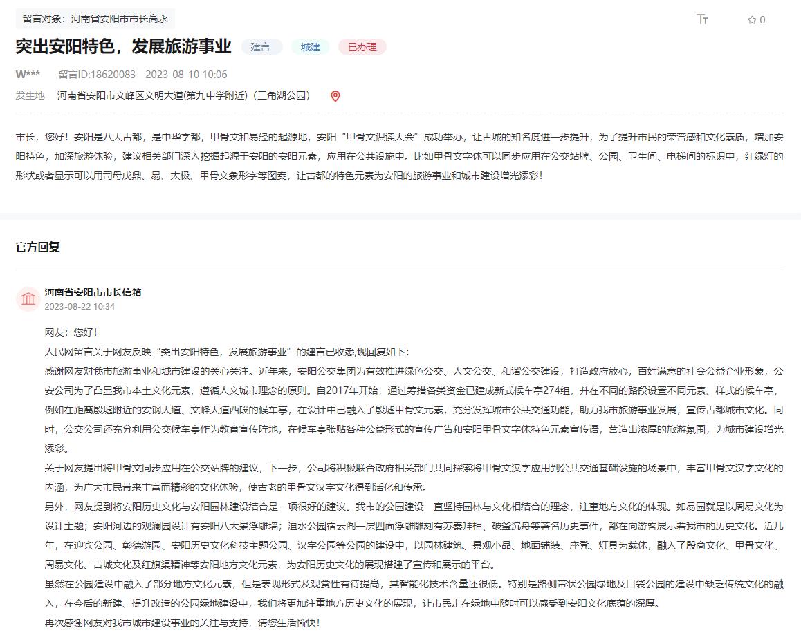 “近期一部名叫《封神》的电影火遍神州大地,应趁此时机,加强与鹤壁、新乡的联动合作。”安阳一名群众通过留言板留言,建议在原安阳旅游通票的基础上加入鹤壁新乡景点,推行三市旅游大通票,并规划安阳鹤壁新乡旅游串联三市景点的旅游大巴,深入挖掘安阳市历史文化底蕴,提升服务质量,打造一批文化氛围浓厚、景色优美、服务舒心的旅游景点,提升安阳旅游城市知名度,打响“中华字都”品牌,实现安阳文旅产业高质量发展。