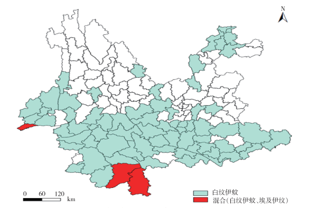 云南省129个县(市、区)主城区发现伊蚊媒介分布有71个,占55.04%,其中主城区仅有白纹伊蚊分布的为68个,占52.71%,埃及伊蚊和白纹伊蚊共同分布的为3个,占2.33%,25个边境县(市、区)中21个有伊蚊分布。见。