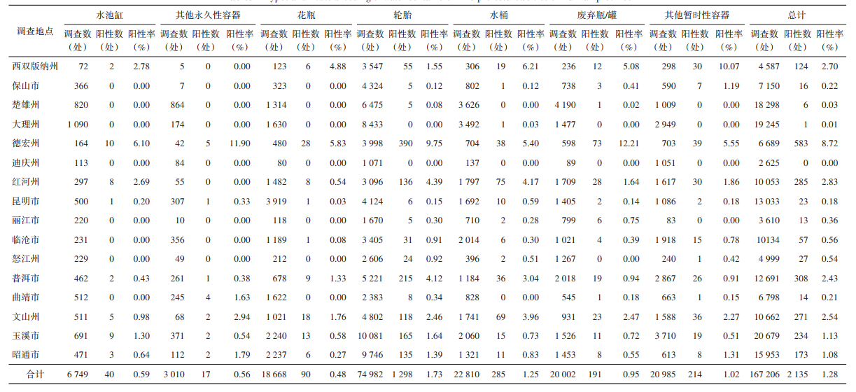 容器阳性率排前5位的是德宏州8.72%(583/6 689)、红河哈尼族彝族自治州(红河州)2.83%(285/10 053)、西双版纳州2.70%(124/4 587)、文山壮族苗族自治州(文山州)2.54%(271/10 662)和普洱市2.43%(308/12 691)。见。