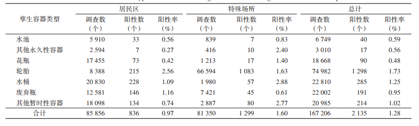 共调查37 198户,阳性1 068户,发现积水容器167 206个,阳性2 135个,BI均值为5.74,HI为2.87%,CI为1.28%。其中,居民区共调查32 305户,阳性642户,发现积水容器85 856个,阳性836个,BI均值为2.59,HI为1.99%,CI为0.97%;特殊场所共调查4 893户,阳性426户,发现积水容器81 350个,阳性容器1 299个,BI均值为26.55,HI为8.71%,CI为1.60%。见。