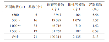不同海拔存在伊蚊分布的县(市、区)共有71个()。海拔在2 000 m以上的县(市、区)未发现伊蚊的存在。采用趋势χ2检验分析伊蚊孳生率和海拔的线性关系(χ2=1 413.993,P < 0.001),随着海拔升高,伊蚊孳生率逐渐下降。