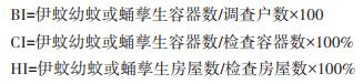 采用布雷图指数(BI)法,调查居民区(家中及周围5 m范围环境)或者特殊场所的所有积水容器,有媒介伊蚊幼蚊或蛹孳生计为阳性,采集阳性容器内的幼蚊,显微镜下鉴定蚊种[]、计数并登记,计算BI、房屋指数(HI)和容器指数(CI)等,计算公式如下: