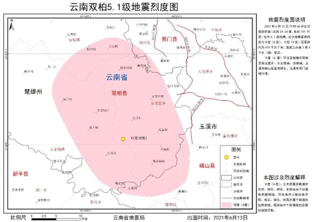 通过对灾区55个调查点的震害调查,参照震区地震构造背景、余震分布、震源机制、仪器烈度等科技支撑成果,结合地表强震动观测记录,确定并编制完成《云南双柏5.1级地震烈度图》,于6月13日由云南省地震局发布。
