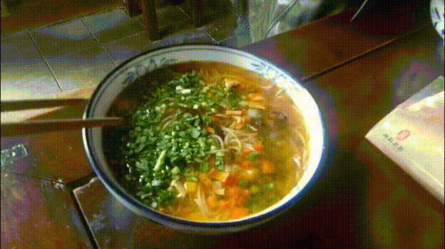 加入土豆、胡萝卜、豇豆、豆腐、木耳、黄花等配菜,再浇上一大勺特调汤汁,最后撒上一把翠绿的韭菜花,一碗色香味俱全的手工挂面就可以上桌了。