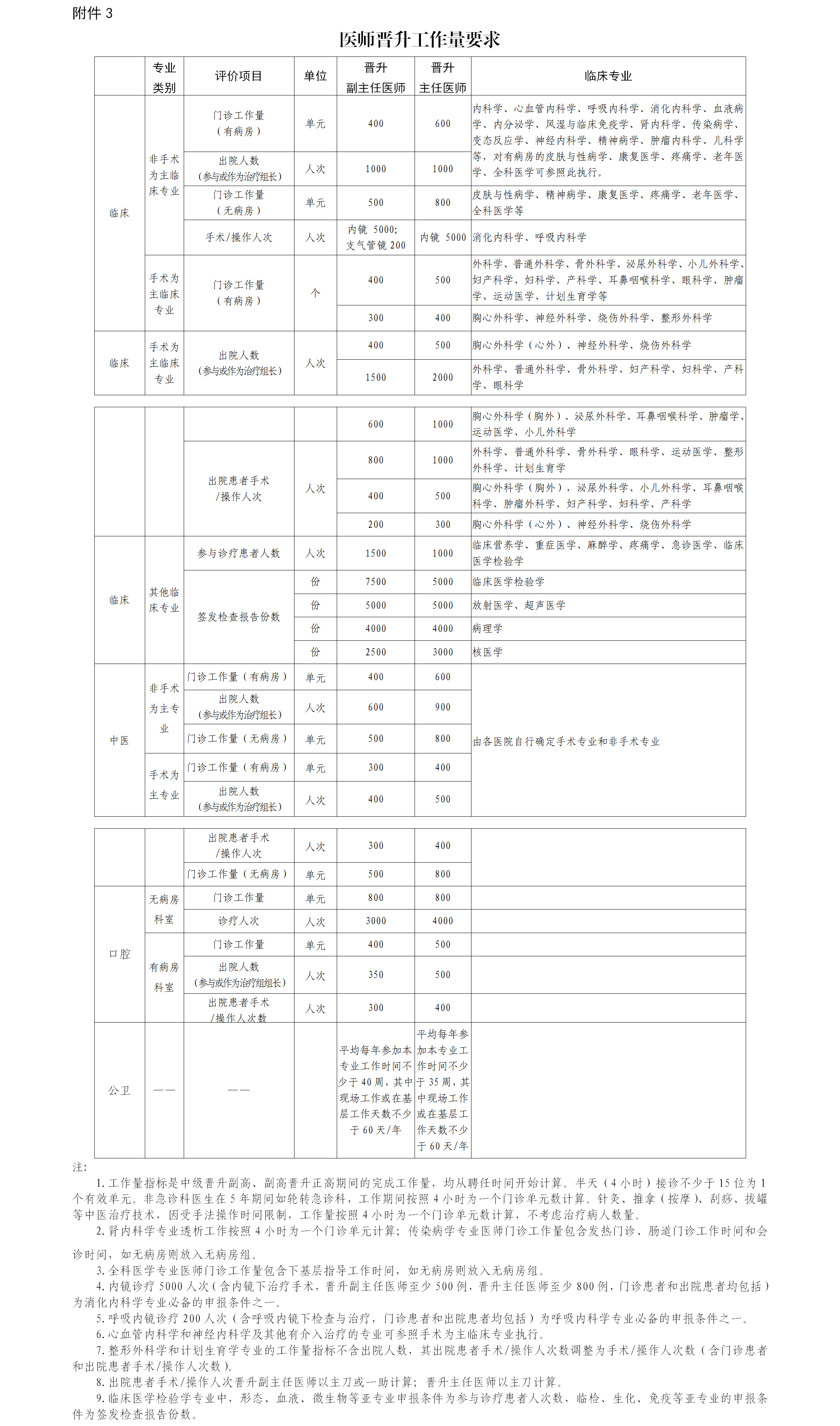 申报高级职称的专业技术人员须在任现职期间完成规定的工作量要求(附件3),工作量指标是中级晋升副高级、副高级晋升正高级期间申报评审专业所完成的工作量,均从聘任现职时间开始计算。服务基层、外出进修期间所完成的工作量可累计计算。