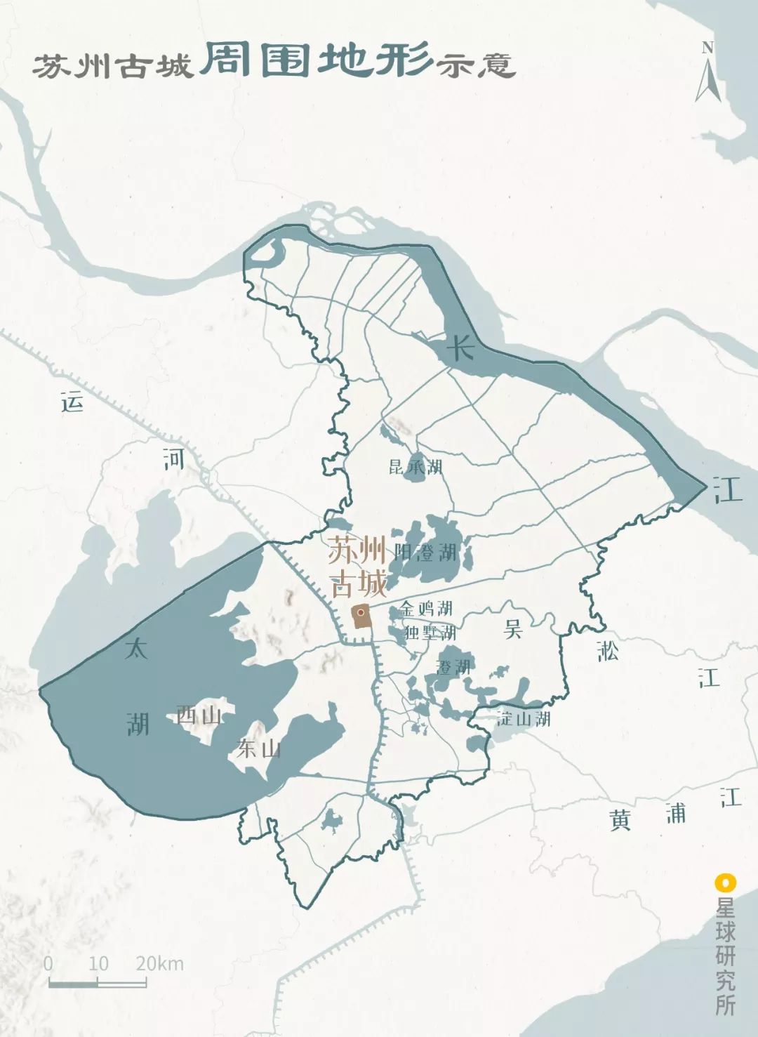 (苏州古城所处地理环境,高亮显示的是现苏州市辖区范围,制图@陈思琦&郑伯容/星球研究所)
