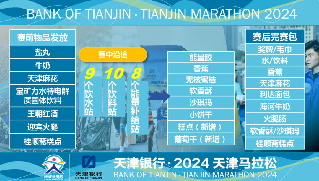 为助力选手顺利完赛,今年赛道沿途共设置了9个饮水站、10个饮料站和8个能量补给站,并向选手提供能量胶、香蕉、无核蜜桔、软香酥、沙琪玛、小饼干以及新增的1至2种补给物资。在赛前领物现场,选手们即可领取盐丸、牛奶、天津麻花、宝矿力水特电解质固体饮料、王朝红酒、迎宾火腿以及桂顺斋糕点等补给,赛后完赛包则为选手配备了奖牌、毛巾、水、饮料、香蕉、天津麻花、利达面包、海河牛奶、火腿肠、软香酥、沙琪玛及桂顺斋糕点等物资。