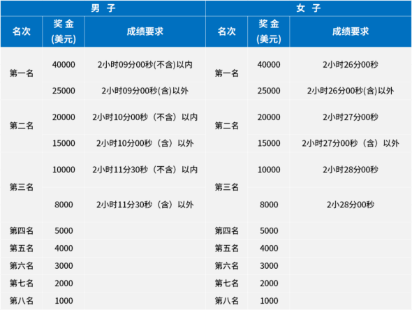 破马拉松世界纪录(男子、女子),奖励10万美元(只奖励第一名)。