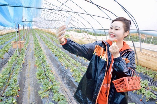 “看你说得这么好,摘一个替我们尝一下。”直播室屏上,粉丝不断呼吁。网红忐忑姐随即摘下一枚香甜诱人的草莓,边吃边对着镜头说:“朋友们看到了吗?柔嫩汁多,甜得很!赶快订购吧。”