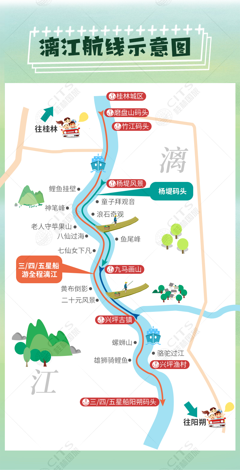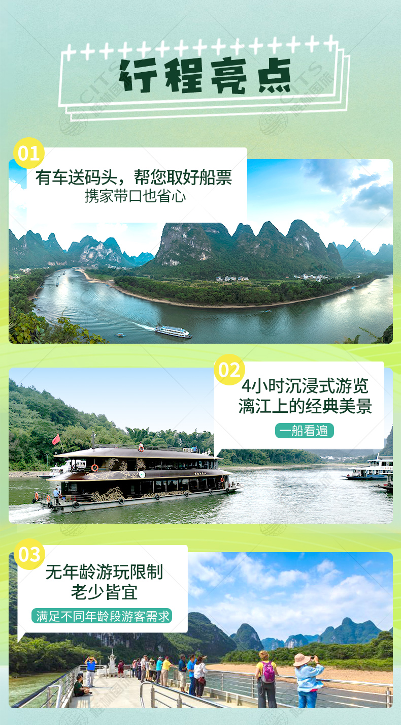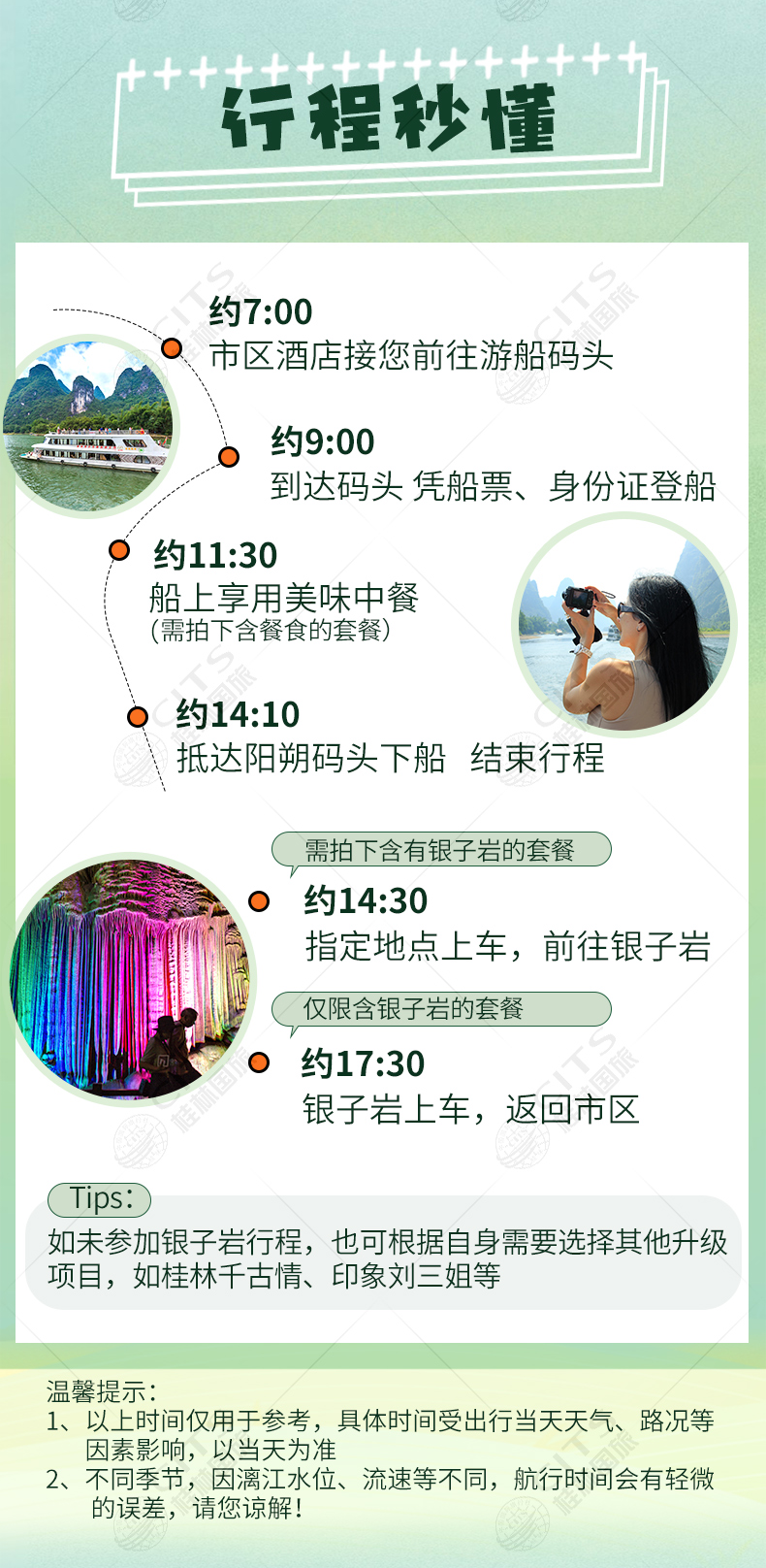 1.交通:当地空调旅游巴士市区酒店接,送至磨盘山或竹江码头,不含银子岩行程的团在阳朔下船后结束行程,包含银子岩的行程可在阳朔结束,也可以在桂林站附近统一解散,不含送回酒店的费用。