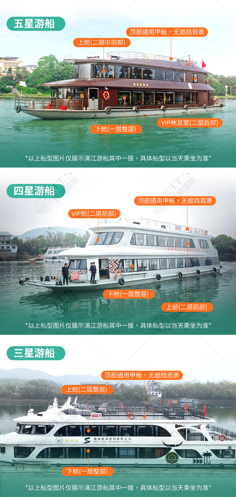 ⑥四星船默认为下舱,如需升舱,升级上舱需补差价40元/人,升级VIP舱需补差价90元/人,升级舱位的价格不在票面上体现;