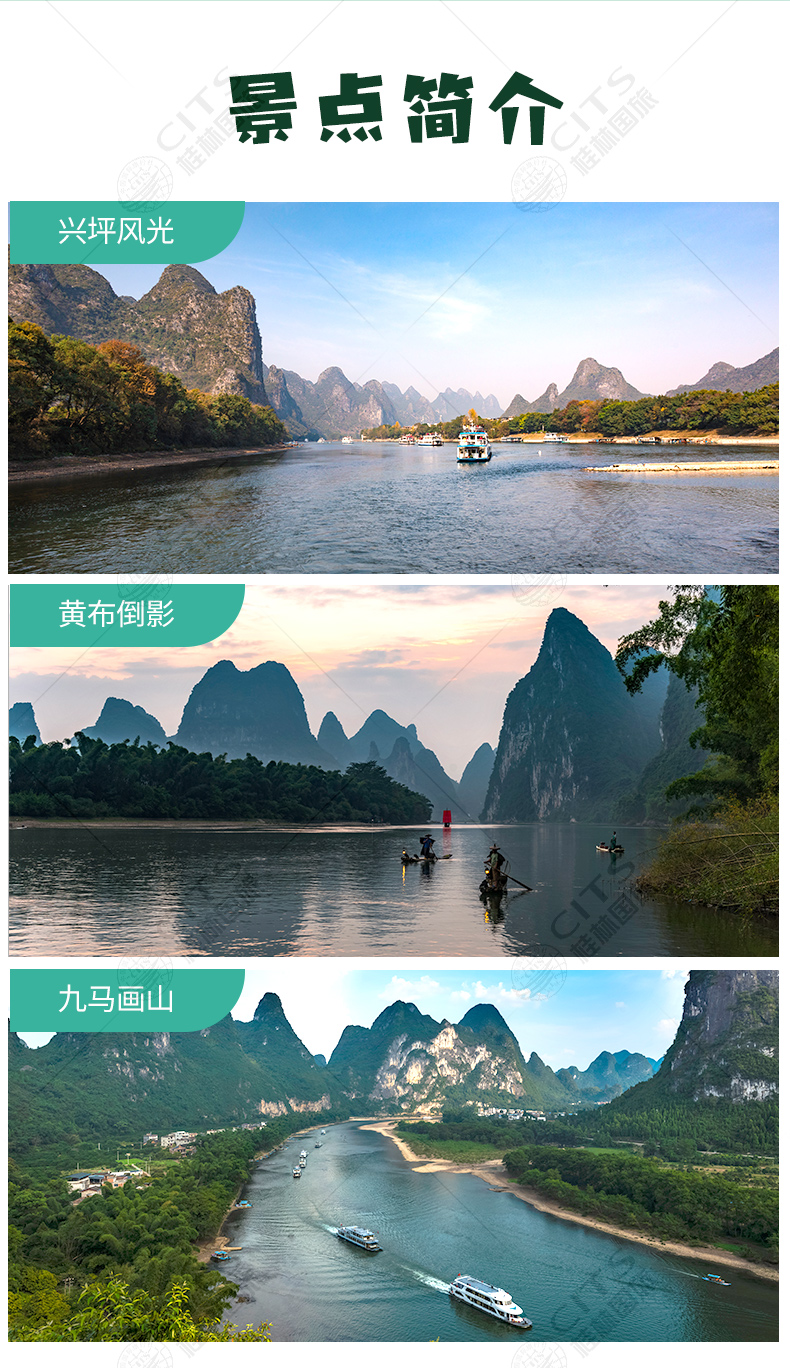 【豪华船漓江】乘坐豪华游船游览百里漓江,青峰夹岸,绿水萦洄,峡谷峭壁,悬泉飞瀑,绿洲险滩,奇洞美石,画卷随着游船顺流而下逐渐展开。沿途景观有:九马画山、黄布倒影、杨堤风光、兴坪佳境。游船时长约4H左右(水流大小会影响游览时长)