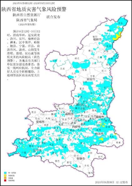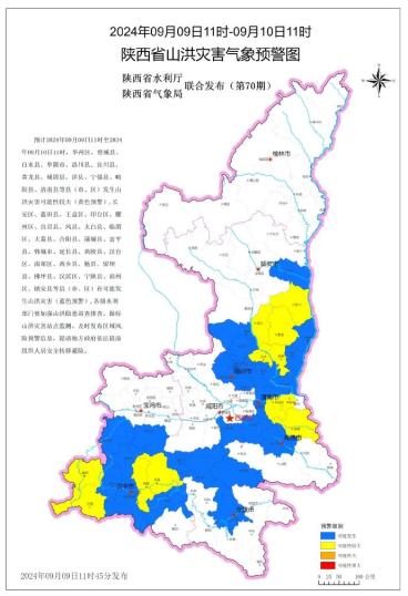 陕西省水利厅与陕西省气象局联合发布山洪灾害气象预警:预计2024年09月09日11时至2024年09月10日11时,华州区、澄城县、白水县、华阴市、洛川县、宜川县、黄龙县、城固县、洋县、宁强县、略阳县、洛南县等县(市、区)发生山洪灾害可能性较大(黄色预警),长安区、蓝田县、王益区、印台区、耀州区、宜君县、凤县、太白县、临渭区、大荔县、合阳县、蒲城县、富平县、韩城市、延长县、黄陵县、汉台区、南郑区、西乡县、勉县、留坝县、佛坪县、汉滨区、宁陕县、商州区、镇安县等县(市、区)有可能发生山洪灾害(蓝色预警),各级水利部门要加强山洪隐患巡查排查,做好山洪灾害站点监测,及时发布区域风险预警信息,提请地方政府依法提前组织人员安全转移避险。