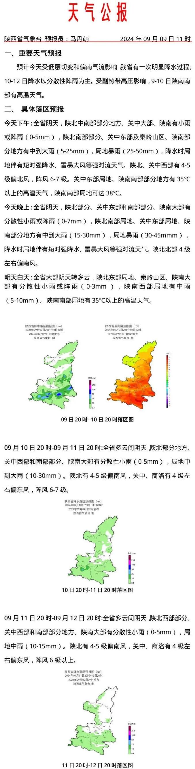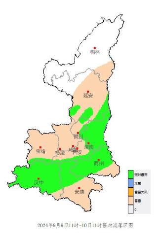 受副热带高压和低层切变共同影响,预计9月9日11时至10日11时(未来24小时),陕北中南部、关中、陕南有雷暴天气,其中延安南部部分地方、铜川北部及东部局地、渭南、宝鸡南部局地、西安东部及南部局地、汉中大部、安康中北部、商洛大部有短时强降水(最大小时雨强20-40mm/h,个别点可达60mm/h以上),局地伴有雷暴大风(阵风8级以上)或冰雹等强对流天气。此次过程具有对流性强、局地性强的特点,请相关部门研判雷电、短时强降水、风雹天气可能带来的风险。做好强降水影响区域城市内涝、山洪以及滑坡、泥石流、崩塌等地质灾害的应急防御工作。采取措施降低对学生返校、户外游乐设施、交通运输、高空作业、输电线路、农业设施等生产生活的不利影响。公众要根据当地政府安排果断及时撤离,远离临水临崖等灾害易发地带。妥善安置易受大风影响的室外物品,远离临时搭建物、高空构筑物等危险部位。降水的对流性强,落区有不确定性,相邻地区也需高度关注,请及时关注当地气象部门发布的短时临近预报预警信息。