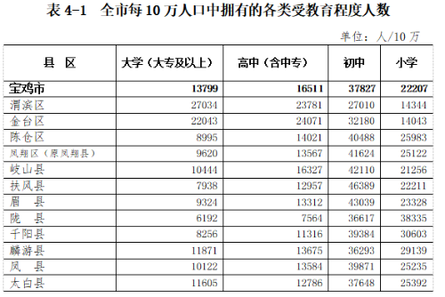 同2010年第六次全国人口普查相比,每10万人口中拥有大学文化程度的由8037人上升为13799人;拥有高中文化程度的由16877人下降为16511人;拥有初中文化程度的由42148人下降为37827人;拥有小学文化程度的由23605人下降为22207人。