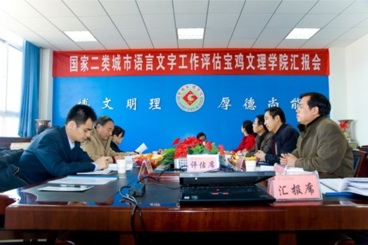 12月22日上午,国家二类城市语言文字评估小组专家、西安市莲湖区政协副主席王珞琳等在宝鸡市教育局党组书记肖炳良等的陪同下,到宝鸡文理学院就宝鸡市迎接国家二类城市语言文字工作进行评估检查。该院党委书记、院长王志刚在汇报会开始前会见了王珞琳一行。随后,该院在新校区第一会议室组织召开汇报会。该院副院长、语言文字工作委员会主任傅志军出席并主持汇报会,语言文字工作委员会副主任、教务处处长杨子元,语言文字工作委员会委员、教务处副处长孙新等参加了汇报会。