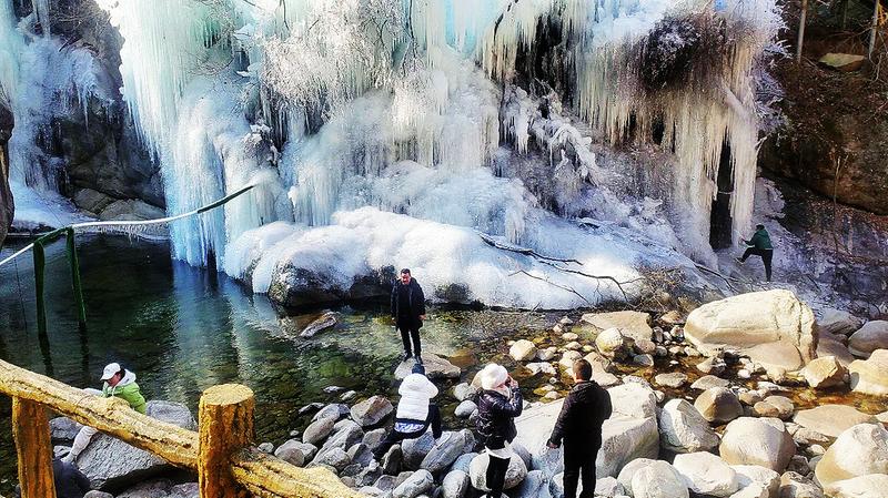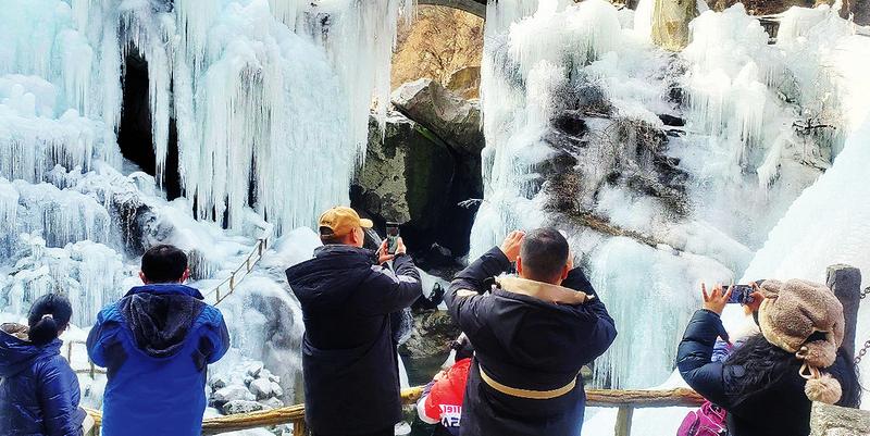 游客在红河谷景区人工冰瀑打卡