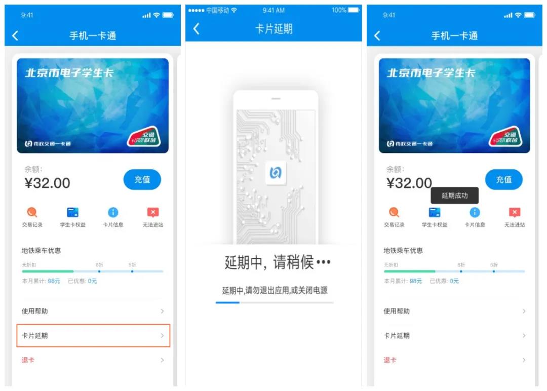 北京市电子学生卡每年9月30日到期,有效期为一年,到期后经身份核验后有效期顺延。具体延期方法如下:打开北京一卡通APP,在首页点击【手机一卡通】,找到电子学生卡后,选择【卡片延期】,即可进行电子学生卡延期。在“卡片信息”中展示最新卡片有效期。