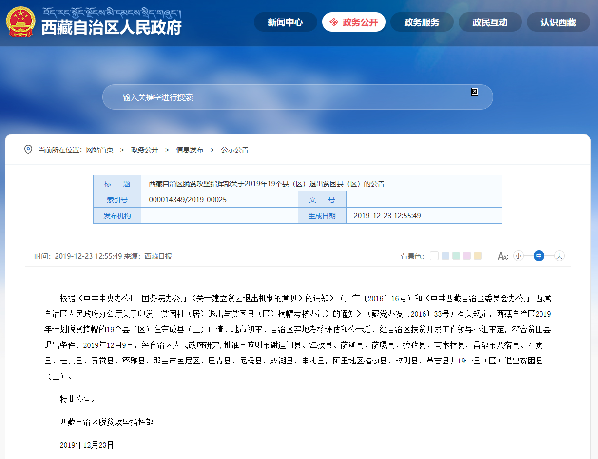 人民网北京12月23日电 据西藏自治区人民政府官方网站消息,西藏自治区贫攻坚指挥部12月23日发布《西藏自治区脱贫攻坚指挥部关于2019年19个县(区)退出贫困县(区)的公告》:“2019年12月9日,经自治区人民政府研究,批准日喀则市谢通门县、江孜县、萨迦县、萨嘎县、拉孜县、南木林县,昌都市八宿县、左贡县、芒康县、贡觉县、察雅县,那曲市色尼区、巴青县、尼玛县、双湖县、申扎县,阿里地区措勤县、改则县、革吉县共19个县(区)退出贫困县(区)。”