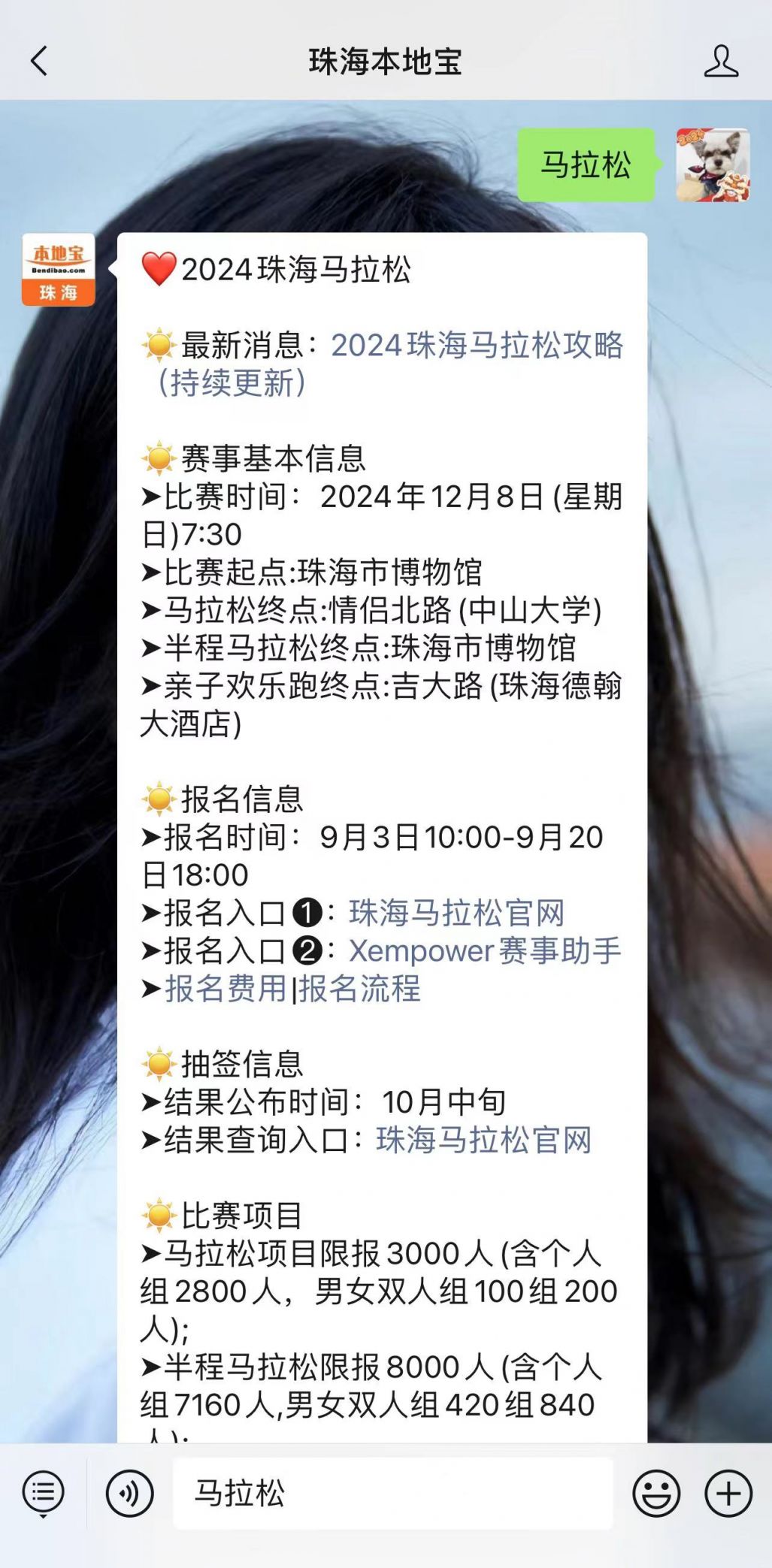 温馨提示:微信搜索公众号【珠海本地宝】,关注后在对话框回复【马拉松】可获2024珠海马拉松最新消息,报名时间/入口/流程/费用等攻略,抽签结果查询时间及入口,比赛日期/线路/项目/规模等攻略。