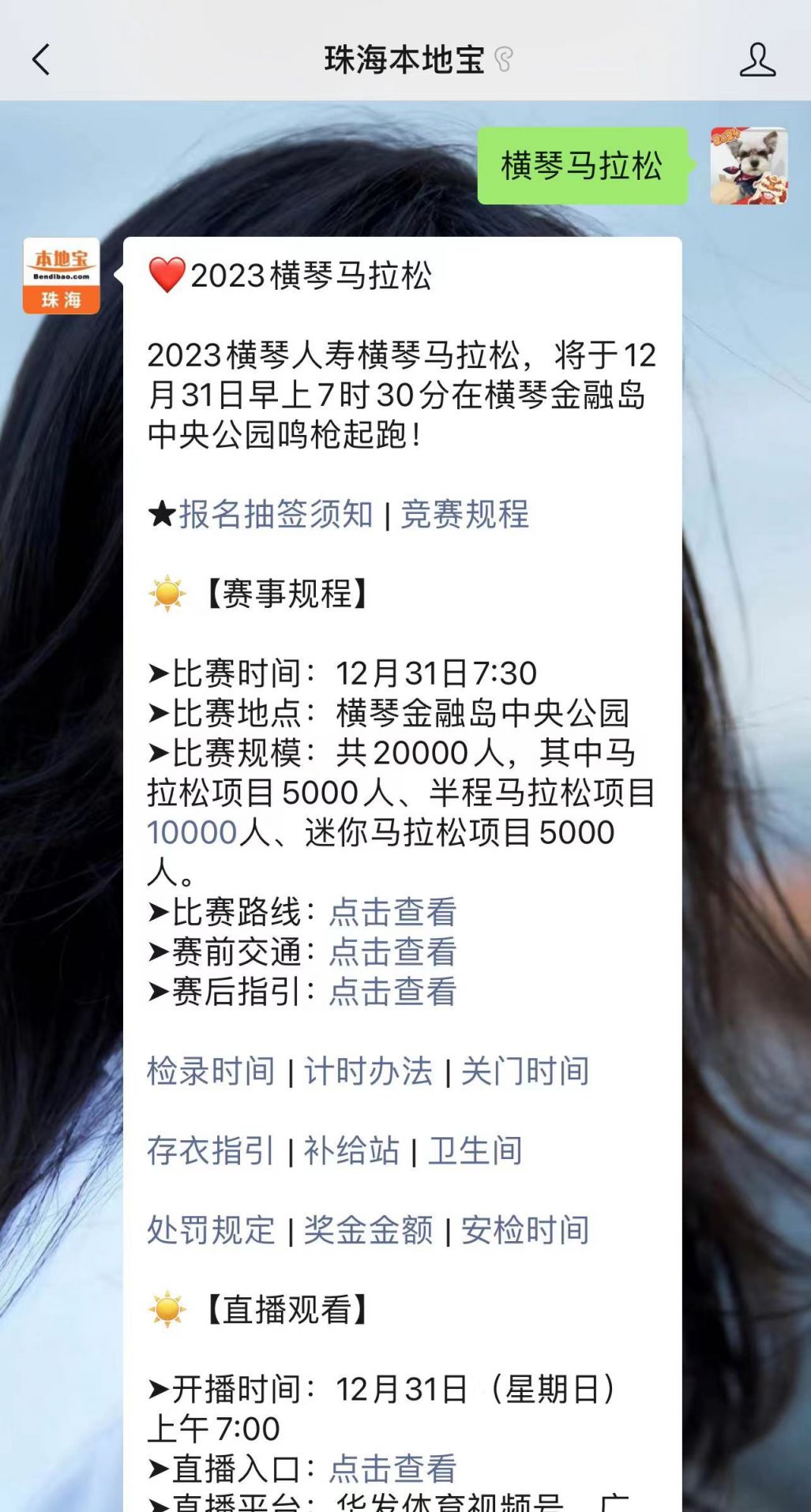 温馨提示:微信搜索公众号【珠海本地宝】,关注后在对话框回复【横琴马拉松】可获2023横琴马拉松直播时间+平台+入口,比赛时间/地点/规模/路线,赛前/赛后交通指引,竞赛规程等。