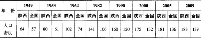 陕西省1949~2009部分年份与全国人口密度变化对照表