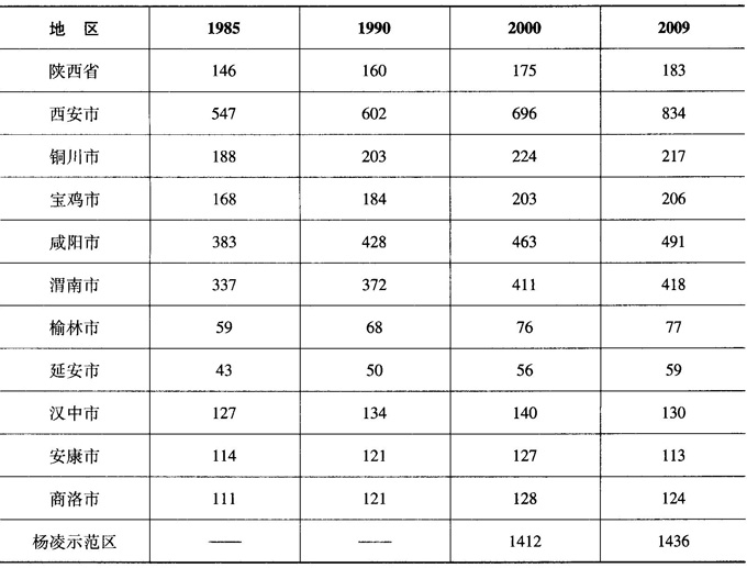 陕西省各设区市和杨凌示范区1985~2009部分年份人口密度统计表