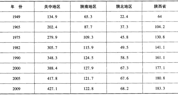 解放以来,这一基本态势未发生明显变化。1949年,关中地区人口密度为135人/平方公里,是全省平均值64人的2.1倍;陕南秦巴山区人口密度为65人/平方公里,基本与全省平均密度持平;陕北地区人口密度为22人/平方公里,是全省平均密度的34%。1957年,全省人口密度每平方公里87.6人,关中地区为每平方公里179人,仍然是全省平均值的2倍以上;陕南人口密度为每平方公里81人,从1949年的略高于全省平均值降到全省平均值以下;陕北地区每平方公里30人,占全省平均值的比重继续保持在34%的水平。据1980年“五五”期末统计,全省人口密度每平方公里138人。关中渭河平原、汉中盆地和汉阴、安康盆地每平方公里300人以上,其中关中平原(不含山区)高达400人以上。陕北长城沿线风沙区、黄龙山区、白于山、子午岭以及秦巴山区的中高山区,人口密度每平方公里不足30人。陕北、陕南其他大部地区平均每平方公里30~200人之间。2009年全省人口密度为每平方公里183人,关中地区每平方公里427人,是全省密度平均值的2.3倍;陕南地区每平方公里123人,是全省密度平均值的67%;陕北地区每平方公里68人是全省密度平均值的37%。