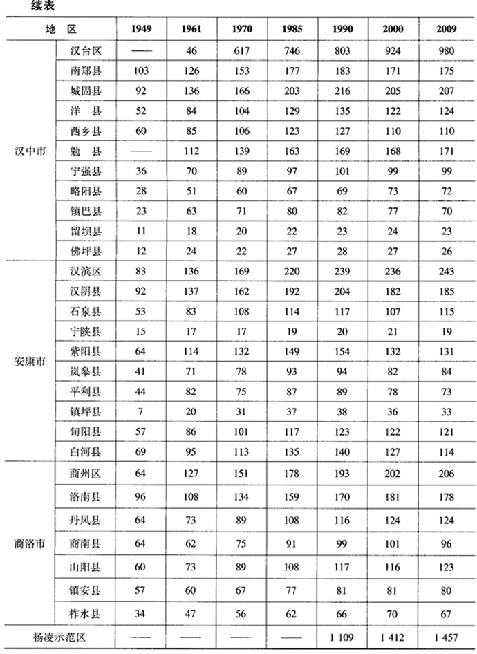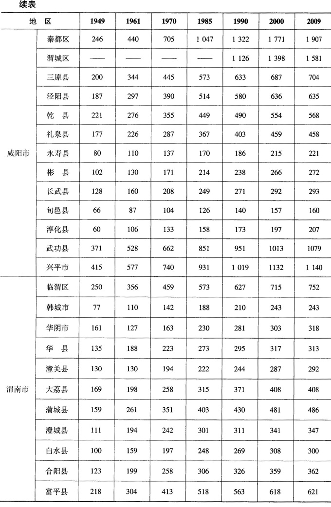 注:1990年及以前数字来自《陕西省人口统计资料汇编1949~1990》;2000年人口数据来自第五次人口普查资料;2009年人口数来自《陕西统计年鉴》2010。2003年,原宝鸡县金河乡、陕塬乡、硖石乡和蟠龙镇4个乡镇划归金台区,晁台区、八鱼镇同时划归渭滨区,引起上述县、区人口密度发生较大变化。表格画横线处无统计资料。