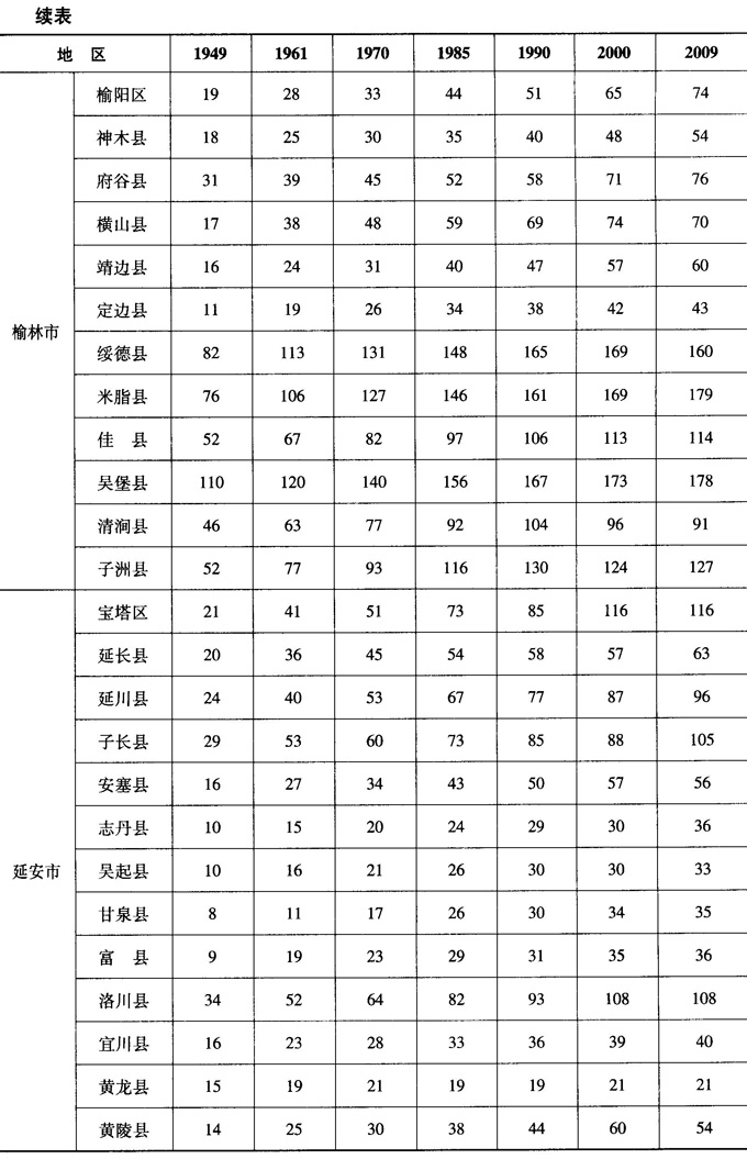 陕西省1949~2009部分年份各县(市、区)人口密度变化表