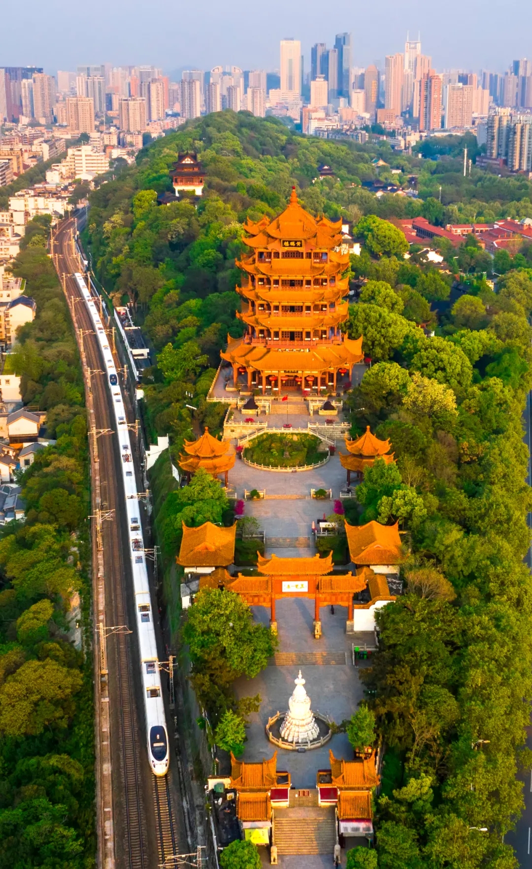 2020年4月12日,武汉市武昌蛇山上春意盎然,一列动车组从黄鹤楼旁边经过。(湖北日报全媒记者 陈勇 摄)