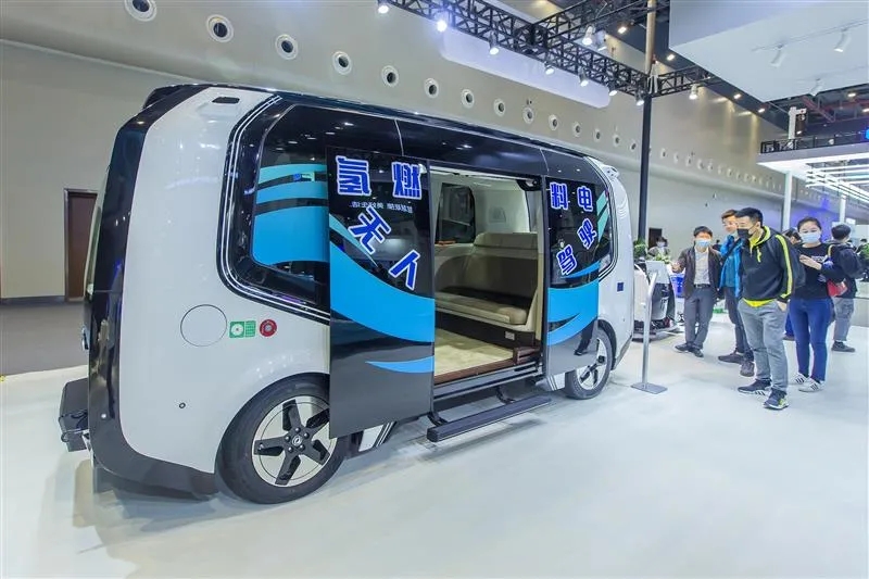 2020年11月20日,中国5G+工业互联网大会在汉举行,这是“5G+工业互联网”领域首个国家级大会。图为氢燃料电池无人驾驶巴士引来众多参观者。(湖北日报全媒记者 梅涛 摄)