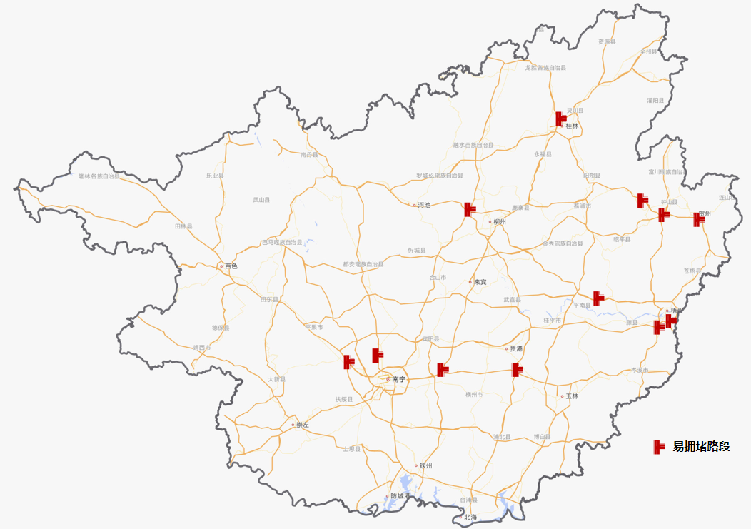 预计有南宁东、安吉、合浦、三江北、阳朔高田等29个收费站可能会出现交通拥堵。主要分布在南宁、北海、柳州、桂林等城市。
