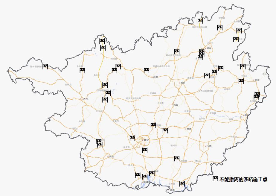 有G75兰海高速南宁至北海段钦江大桥改造重建等36处涉路施工点不能撤离,易因通行能力下降导致拥堵。中秋、国庆期间,原则上不允许施工,紧急抢修危及行车安全的设施或严重路面病害的除外,抢修路段请看链接::9002/gxgscx-public/#/home/homePage(广西高速公路出行信息服务网)