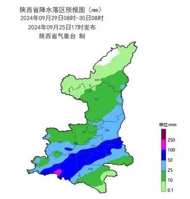 9月29日:陕北北部有小雨(0-10mm),陕北南部、关中大部、陕南部分地方有中到大雨(10-40mm),关中南部、汉中中东部、安康西部和北部、商洛北部有暴雨(50-100mm),汉中南部局地有大暴雨(100-120mm),陕北西部局地、秦岭山区局地有雨转雨夹雪。