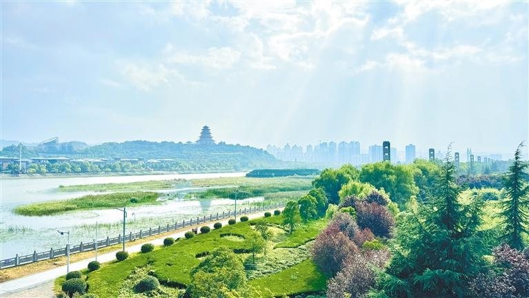 依托渭河生态公园建设,宝鸡沿渭河河堤铺设了休闲绿道,串起沿线景观,为城市增添了山水林人和谐栖居的诗意,实现从“沿河不见河”到“近水更亲水”的转变。