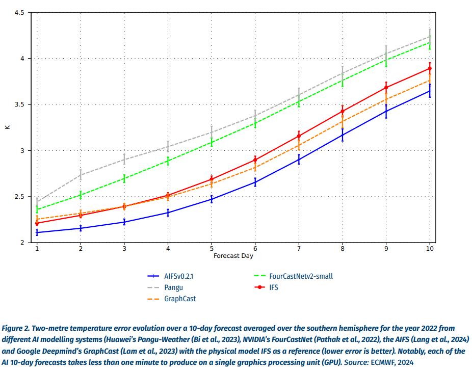 图|2022 年不同 AI 建模系统(华为的 Pangu-Weather、NVIDIA 的 FourCastNet、AIFS 和 Google DeepMind 的 GraphCast)在南半球进行 10 天预报期间的两米温度误差演变。(来源:欧洲中期天气预报中心,2024)