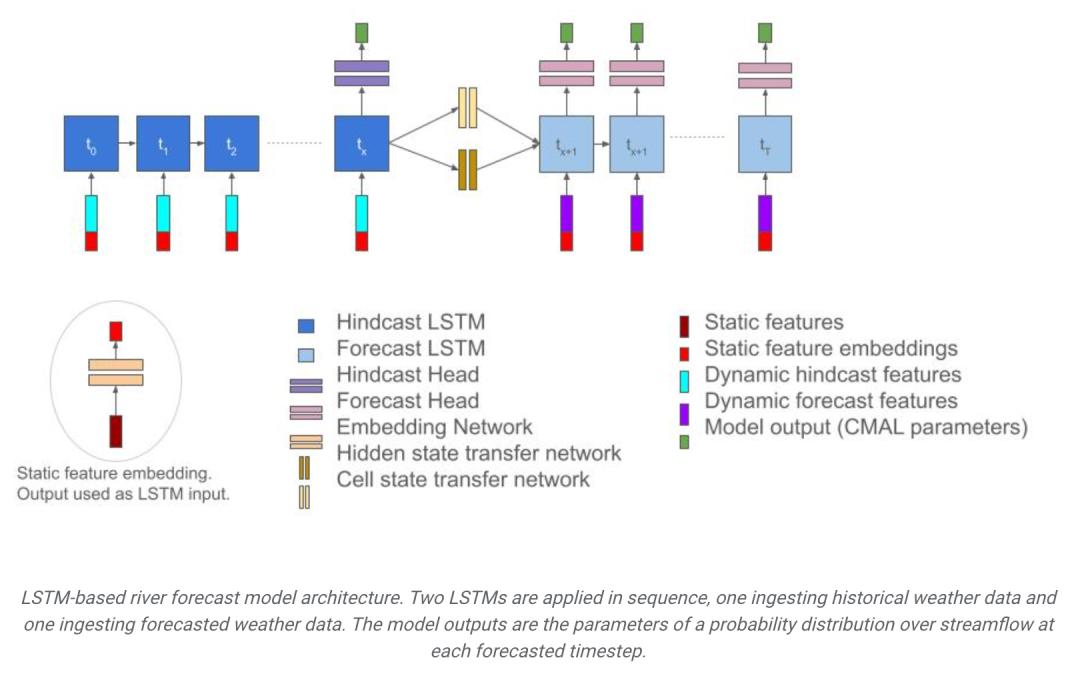 图|基于 LSTM 的河流预报模型架构。两个 LSTM 依次应用,一个接收历史天气数据,另一个接收预测天气数据。模型输出为每个预报时间步的流量概率分布参数。