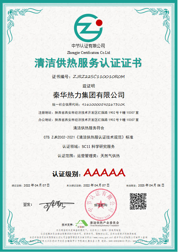 2022年4月7日,秦华热力集团有限公司凭借卓越的天然气供热项目运营管理荣获清洁供热服务认证5A证书。