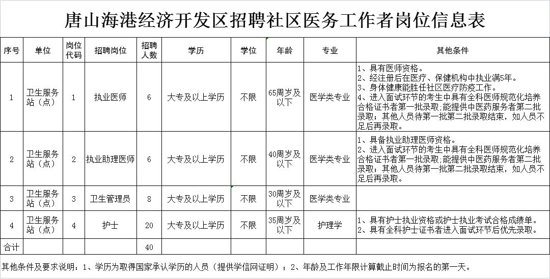 3、唐山海港经济开发区拟招聘社区医疗服务人员40名。