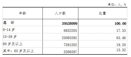 全省常住人口中,0-14岁人口为6852205人,占17.33%;15-59岁人口为25085592人,占63.46%;60岁及以上人口为7591202人,占19.20%,其中65岁及以上人口为5266597人,占13.32%。与2010年第六次全国人口普查相比,0-14岁人口的比重增加2.62个百分点,15-59岁人口的比重下降8.98个百分点,60岁及以上人口的比重增加6.35 个百分点,65岁及以上人口的比重增加4.79个百分点。